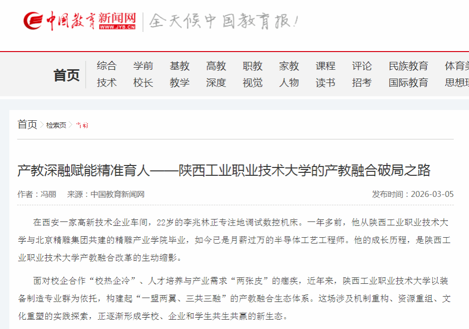 中国教育新闻网:产教深融赋能精准育人——陕西工业职业技术大学的产教融合破局之路
