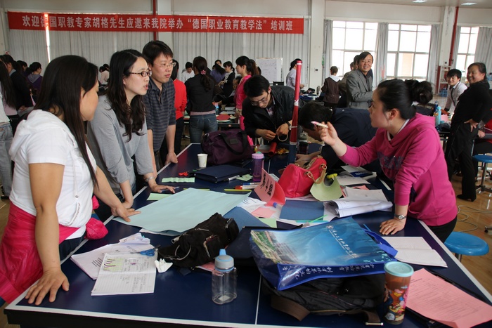 通过四天的培训学习,学员们深刻认识到在职业行动能力中方法能力是核心,专业能力和社会能力是基础。学员们通过对比以往的教学模式和教育方法,深受启发,对学习领域下的教学法和教学质量的内涵有了一个更深层次认识。大家纷纷表示,德国先进的职业教育教学理念带给他们的思想冲击是强烈的,四天的培训收获充分证明了胡革教授所传授的职业教育教学法是成功和有效的,今后,学员们将结合实际,认真领会和体验职业教育课程行动导向教学法的深刻内涵,并切实运用到教学实践中去。