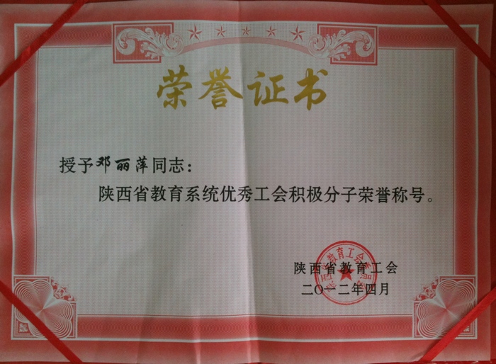 邓丽萍同志获“优秀工会积极分子”荣誉称号