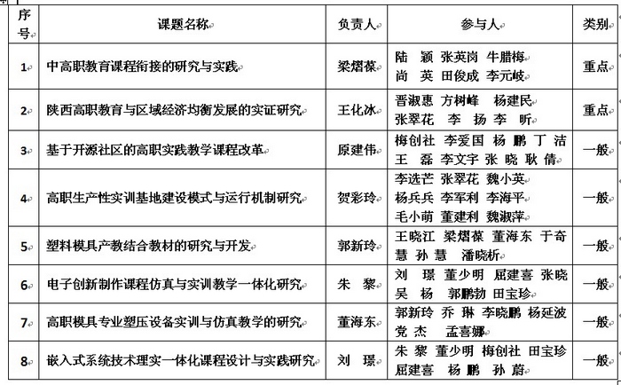 根据中国机械工业教育协会“关于公布机械行业2011年度职业教育研究立项课题的通知”(中机教协〔2011〕第24号文件),我院申报的8项课题全部获得立项。其中梁熠葆教授主持的“中高职教育课程衔接的研究与实践”和王化冰副教授主持的“陕西高职教育与区域经济均衡发展的实证研究”获批重点课题,其余6项为一般课题。