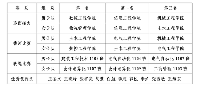 经过紧张激烈的竞赛,各项目分别决出了男女组冠亚季军,另有10名学生被评为优秀裁判员。