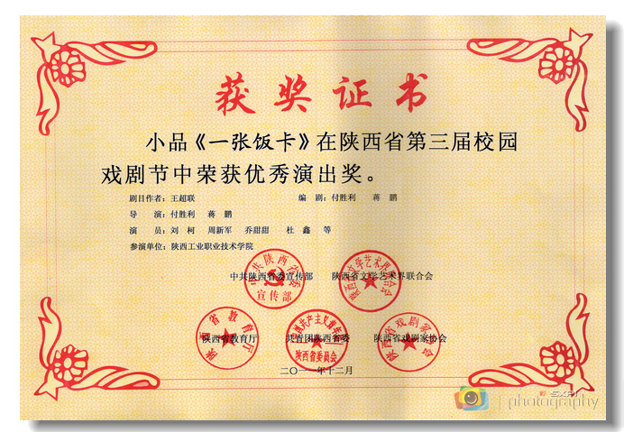 12月8日晚,由陕西省委宣传部、省文联、省教育厅等多家单位主办的陕西省第三届校园戏剧节颁奖晚会在西安举行,来自全省30余所参演院校的相关负责人、学生代表等千余人出席了颁奖活动。本届艺术节共评出4个优秀剧本奖、7个优秀剧目奖、7个优秀演出奖。我院选送的小品《一顿午餐》和《一张饭卡》分别获得优秀表演奖和优秀剧目奖,我院同时获得优秀组织奖。党委副书记王天哲、学工部部长王超联等出席了颁奖晚会,小品《一张饭卡》还参加了闭幕式优秀剧目展演。