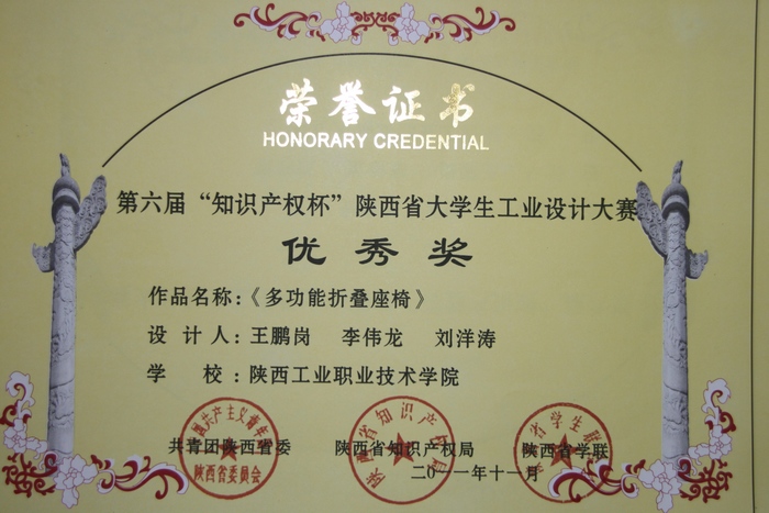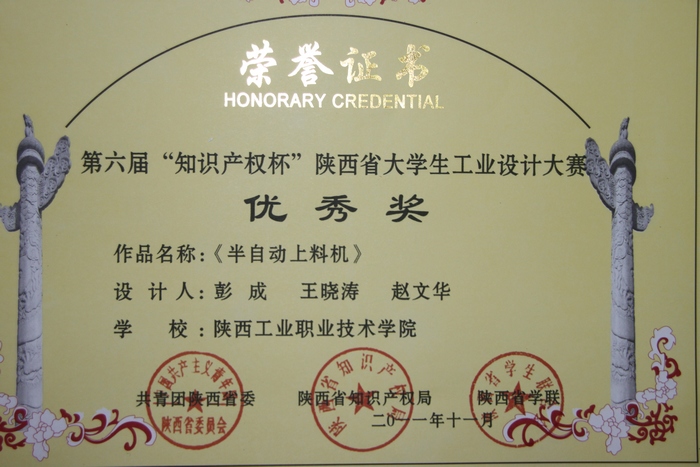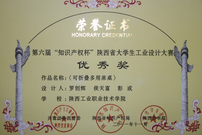 11月25日,由共青团陕西省委、省知识产权局、省学联联合举办的第六届“知识产权杯”陕西省大学生工业设计大赛颁奖典礼在长安大学举行,主办方相关领导及获奖选手参加了典礼。我院共报送了15件作品,其中罗创辉、侯天富等设计的可折叠多用床桌,王鹏岗、李伟龙等设计的多功能折叠座椅,彭成、王晓涛等设计的半自动上料机三件作品,荣获了优秀奖。此外,我院是唯一一所获奖的高职院校。
