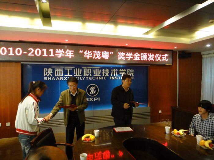 10月28日下午,2010-2011学年“华茂粤”奖学金颁奖仪式在我院第一会议室举行。我院校友深圳市华茂粤电子有限公司总经理岳艳晖分别为机制1005张苗苗、服设1001姚明、检测0902张少妮等10名同学颁发了“华茂粤”奖学金荣誉证书。院党委副书记王天哲 、学生处副处长张智清及学生资助管理中心工作人员参加了颁奖仪式。