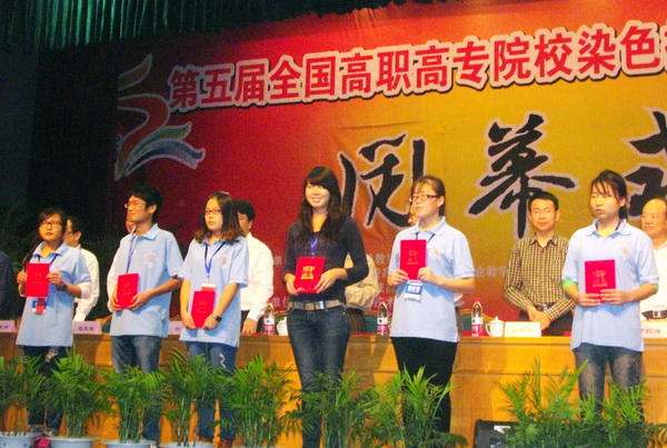 本次大赛共有来自20所高职高专院校的97名参赛选手参加,分理论知识和实际操作考核两项进行角逐。化工与纺织学院染整1001班的5名同学组成我院代表队,由卢寅老师带领参加了比赛。最终,侯佳欣同学荣获二等奖;王瑞花、乔丹、黄铮同学荣获三等奖;熊飞同学荣获优秀奖。