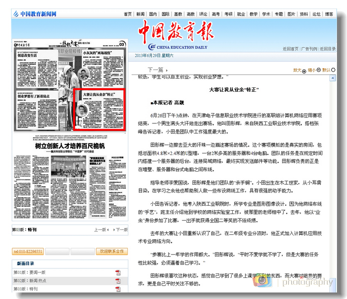 6月29日,《中国教育报》在第3版刊发全国职业院校技能大赛参赛选手专访,我院计应1101班、全国职业技能大赛网络应用赛项团体二等奖获得者田彤辉同学接受该报记者访谈,并以《技能大赛让我从业余“转正”》刊发。凤凰网、新民网等媒体予以转载。