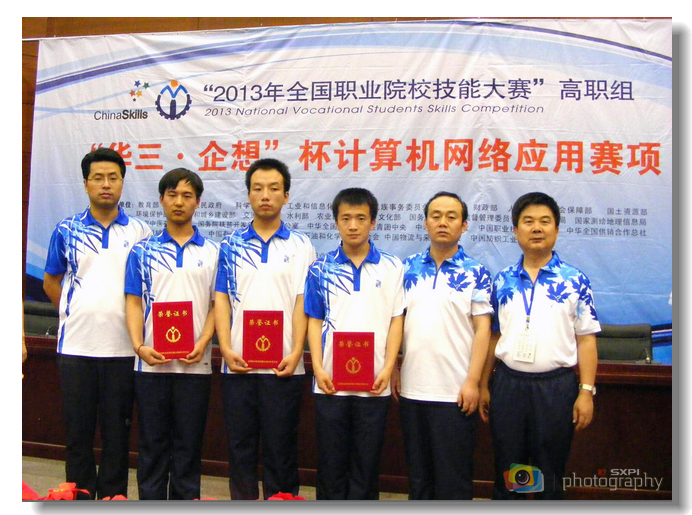 田彤辉同学(右三)与其他参赛选手、指导教师、领队在全国职业院校技能大赛上
