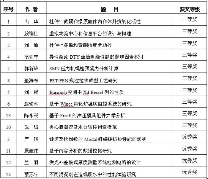 近日,根据咸阳市人民政府《关于表彰咸阳市第六届自然科学优秀学术论文的通报》(咸政函[2013]36号文件),我院申报的14篇自然科学论文分获咸阳市第六届自然科学优秀论文一等奖、三等奖及优秀奖,其中尚华教授撰写的“杜仲叶黄酮和绿原酸体内和体外抗氧化活性”论文获一等奖,殷锋社等9位教师撰写的论文获三等奖,兰羽等4位教师撰写的论文获优秀奖。详见下表: