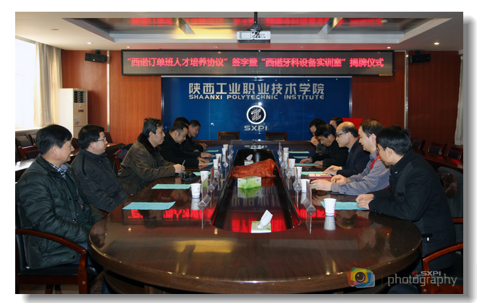 1月2日下午,我院与西北医疗器械(集团)有限公司“西诺”订单班人才培养协议签字暨“西诺牙科设备实训室”揭牌仪式在崇文南楼第一会议室举行。西北医疗器械(集团)有限公司总经理李爱国、营销总监窦波、总经办主任聂西社、技术部副经理魏小峰、手机事业部制造部经理何林昌、总装车间主任刘登峰和我院院长崔岩、副院长王晓江、教务处、数控工程学院相关负责同志出席,王晓江副院长主持仪式。