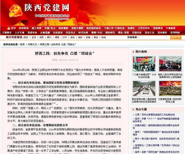 近日,陕西党建网以《陕西工院:创先争优 凸显“四结合”》为题,解读我院结合示范院校建设、两校合并工作、学习型组织建设和管理效能提升年活动开展创先争优活动,取得实效的经验和做法。
