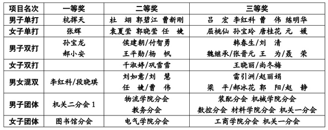 11月17日晚,随着图书馆分会代表队与机械学院分会代表队混双比赛在现场观众的欢呼声中结束,2011年教职工乒乓球比赛的七个项目的所有比赛圆满结束。