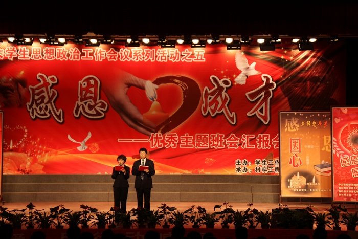 12月6日下午,学工部主办,材料工程学院党总支承办的“大学生思想政治工作系列活动之五 ——《感恩·成才》优秀主题班会汇报会”在明德大礼堂隆重举行。