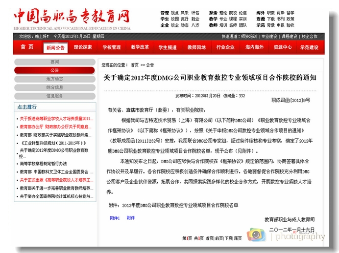 近日,根据教育部“职成司函[2012]9号”通知精神,在教育部职业与成人教育司联合DMG公司专家组经过条件审核和专业考察后,确定我院为2012年度DMG公司职业教育数控专业领域项目合作院校之一。
